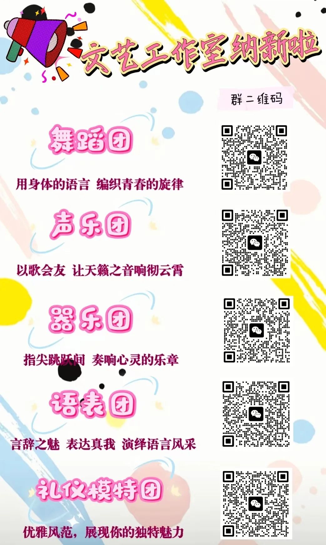 yl6809永利集团文艺工作室面向学院2024级全体萌新招募舞蹈团、声乐团、器乐团、礼仪模特团成员。无论专业,无论班级,只要热爱舞台,有才艺你就来!欢迎2024级萌新扫码报名~