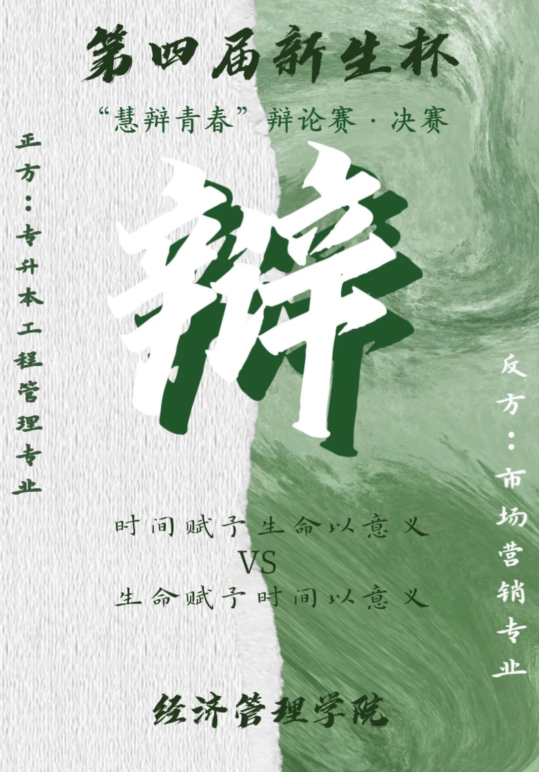 回首初赛、复赛以及半决赛的数周时光,那是一段充满激情与挑战的征程。11支队伍在辩论的浪潮中奋勇搏击,如同繁星争辉。最终,专升本工程管理专业代表队和市场营销专业代表队进入决赛。双方所持的观点是时间赋予生命以意义VS生命赋予时间以意义。