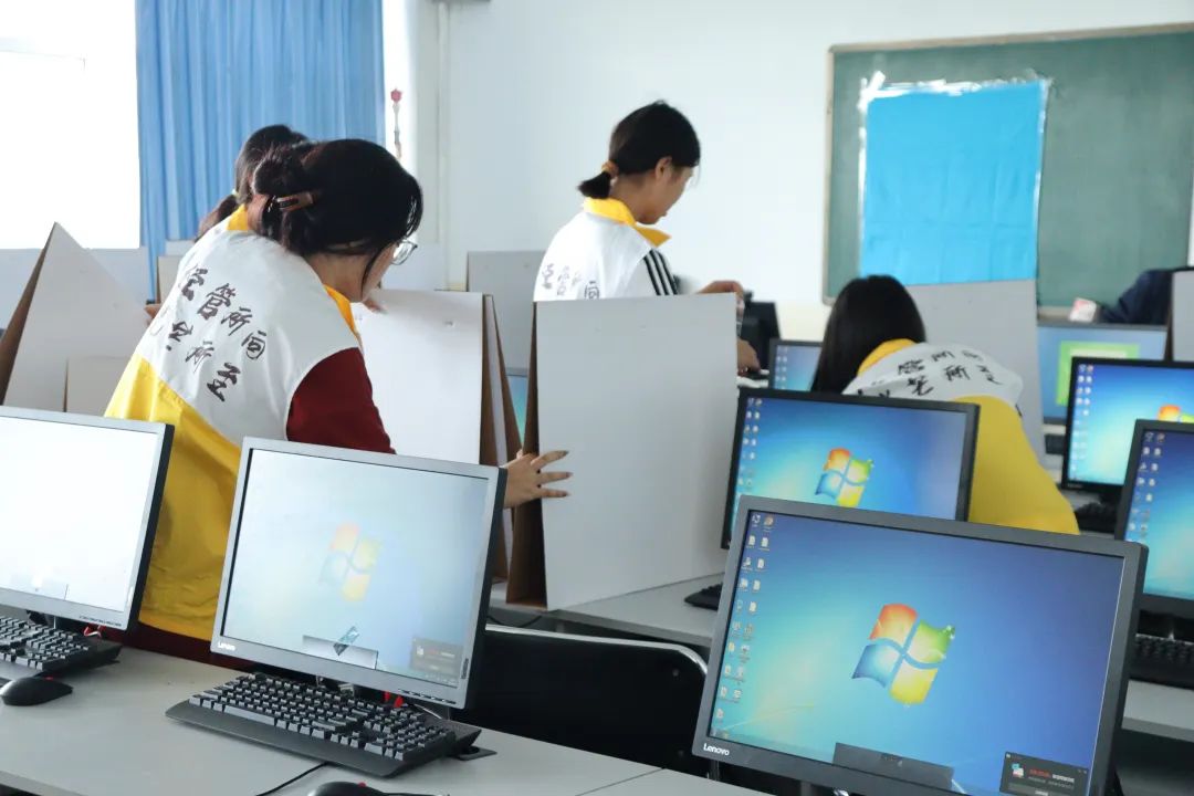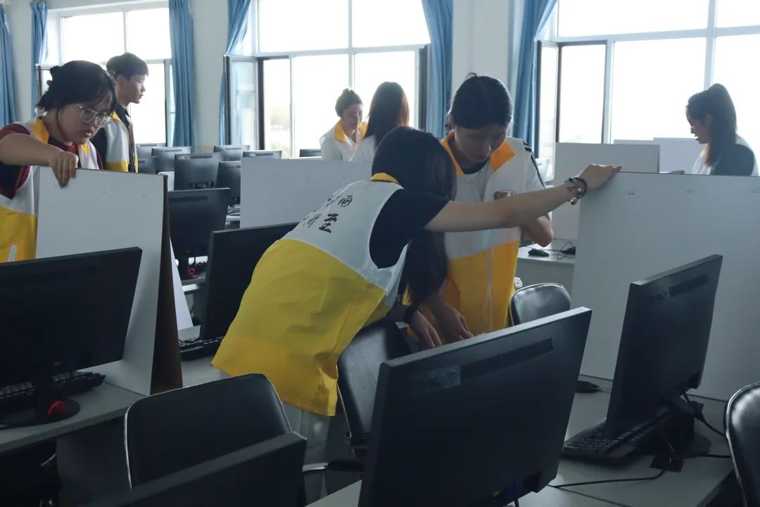 首先,志愿者们承担起摆放桌椅的重任,使考场布局呈现出整齐的状态,然后,张贴考试标识与指引,为考生提供清晰、明确的导向,最后,志愿者们共同对考场设备进行了仔细检查,确保电脑、网络等设施能够处于正常运行状态。